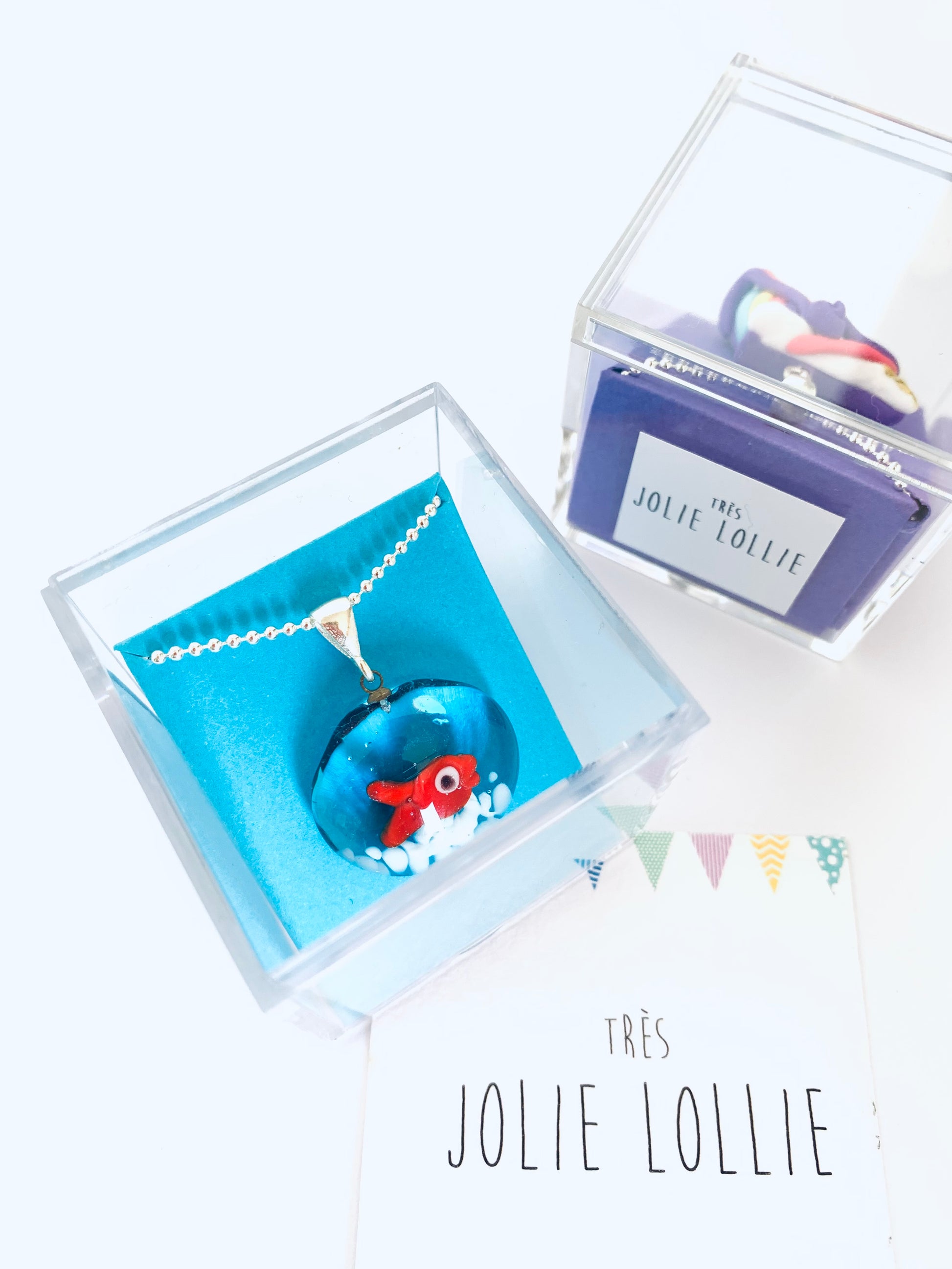 El yapımı cam minik akvaryumda kırmızı balık formlu, 925 ayar gümüş zincirli kolye.