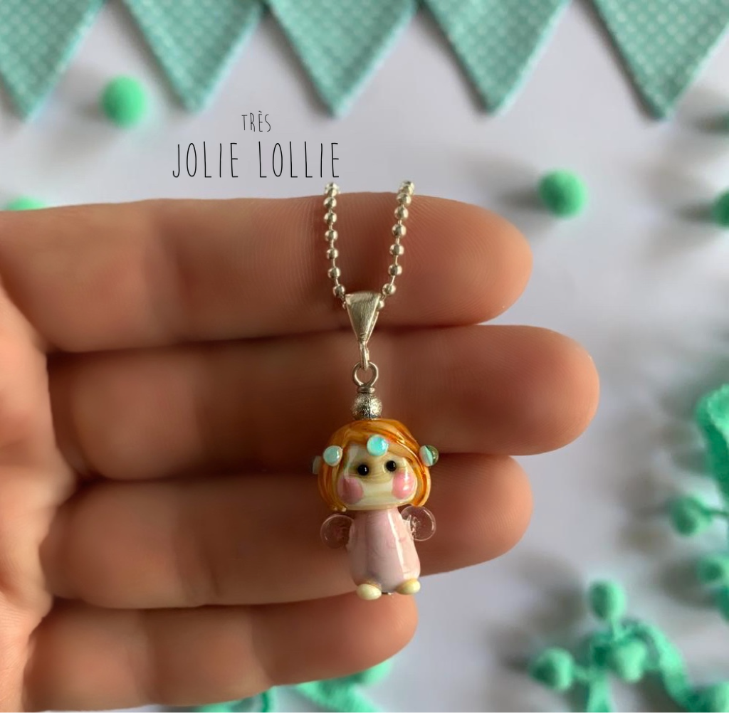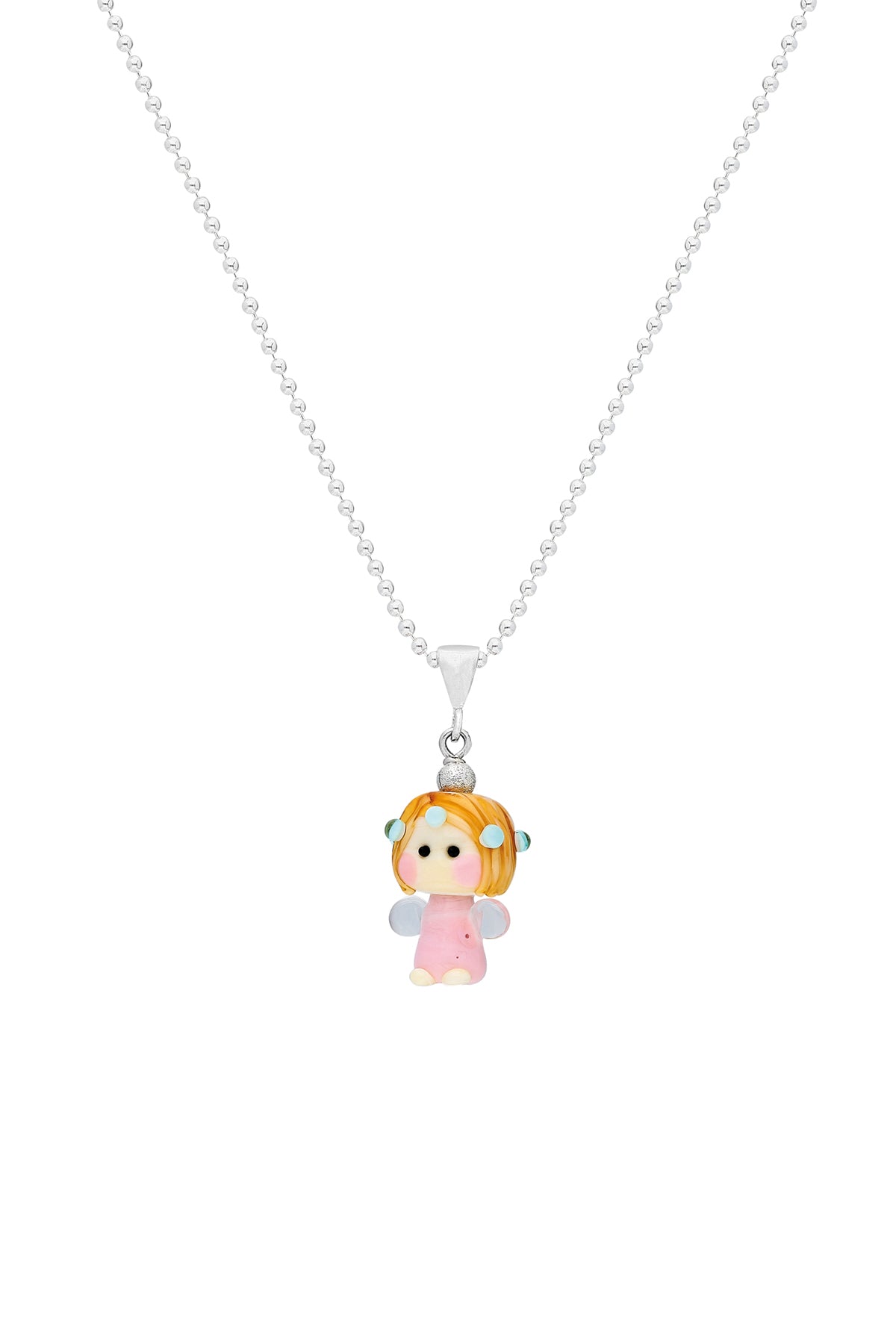 925 ayar gümüş, 50cm top zincir ucunda el yapımı şaloma cam tekniği ile yapılmış peri formlu kolye.